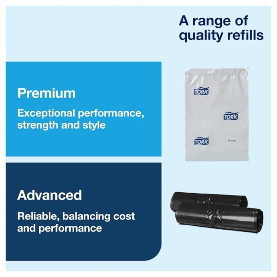 Kosz na odpady Tork 5 l z linii Elevation może służyć za tradycyjny kosz w małych łazienkach lub dodatkowy kosz na odpadki higieniczne wewnątrz kabiny. Automatycznie zamykana pokrywka oraz system ukrywający worki na odpady zapewniają higienę i komfort. Dozowniki Tork Elevation wyróżniają się praktycznym i nowoczesnym wyglądem.