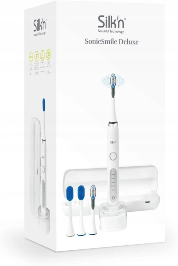 Szczoteczka Deluxe to wyjątkowy produkt, który zachwyca nowoczesnym designem. Przycisk zasilania oraz zmiany trybów pracy został stworzony tak, by idealnie pasować do rękojeści szczoteczki przez co nabiera ona eleganckiego wyglądu. Panel wyświetlania trybów pracy i wskaźnik stanu baterii nadają jej futurystycznego wyglądu, zaś zawarte w zestawie zróżnicowane końcówki, wraz z pięcioma trybami pracy, zapewniają kompleksową opiekę nad uzębieniem każdego użytkownika!