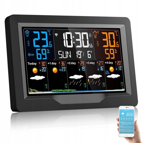 Nasza stacja pogodowa Wi-Fi jest wyposażona w zintegrowaną technologię WiFi i aplikację TUYA Smart do sterowania. Dane godzinowe, daty i pogody są pobierane bezpośrednio z sieci bez ręcznego ustawienia, co jest wygodniejsze i dokładniejsze. Dzięki przejrzystemu i czytelnemu interfejsowi użytkownika można szybko sprawdzić najnowsze wartości temperatury, wilgotności powietrza, UV i wiele więcej. Dzięki kolorowemu wyświetlaczowi naszej stacji pogodowej o przekątnej 7,5 cala otrzymasz wszystkie potrzebne informacje na pierwszy rzut oka. Ponadto domowa stacja pogodowa jest wyposażona w cztery tryby ustawienia podświetlenia tła (20%-50%-80%-100%), dzięki czemu nie musisz się martwić o zakłócenia snu.